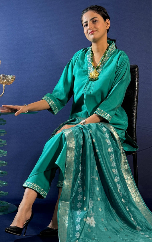 SILK BLEND V-NECK GREEN HAND WORK KURTA SET