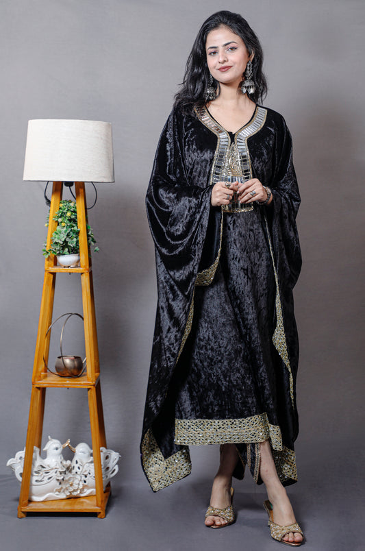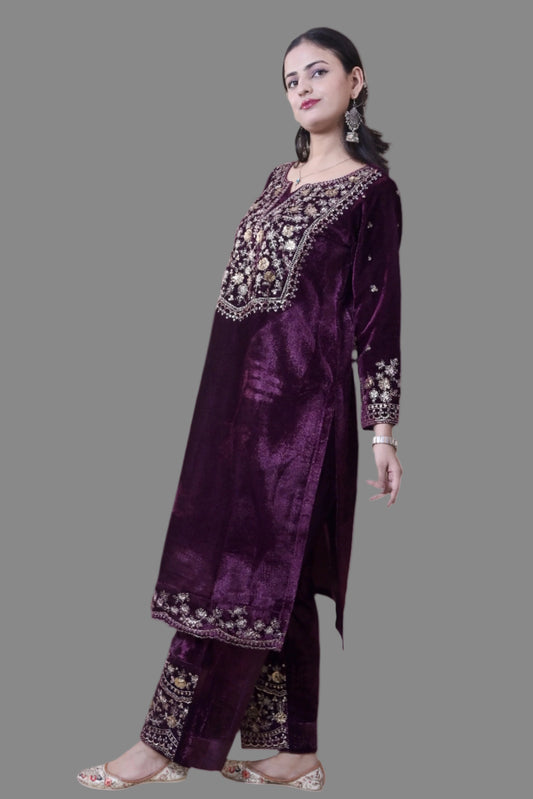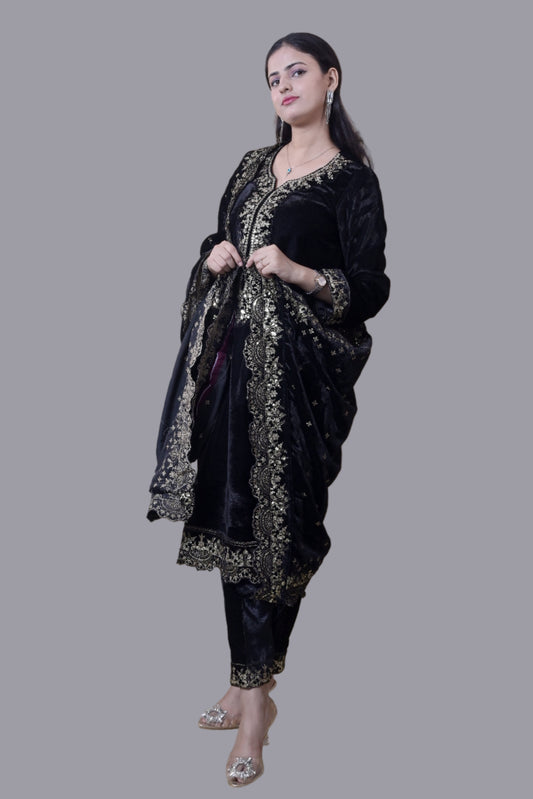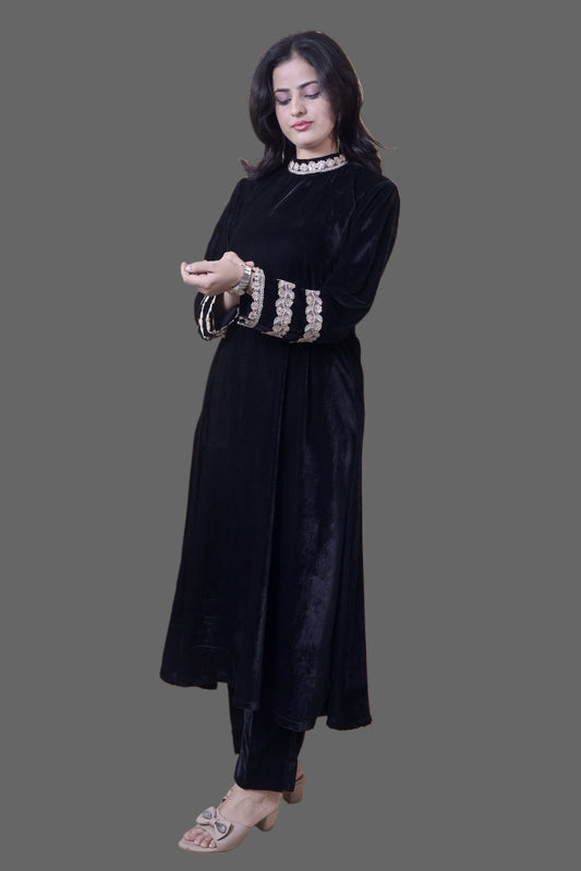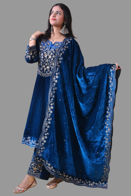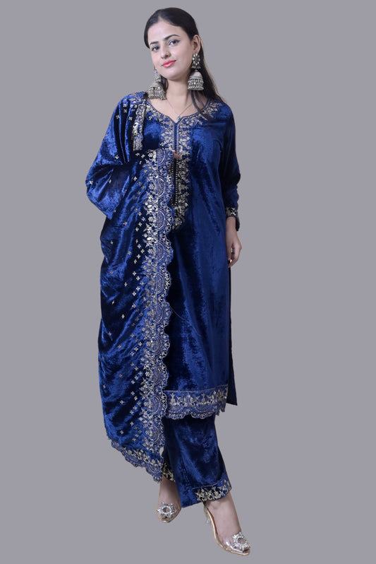Regal Navy Blue Velvet Yoke Design Kurta Set