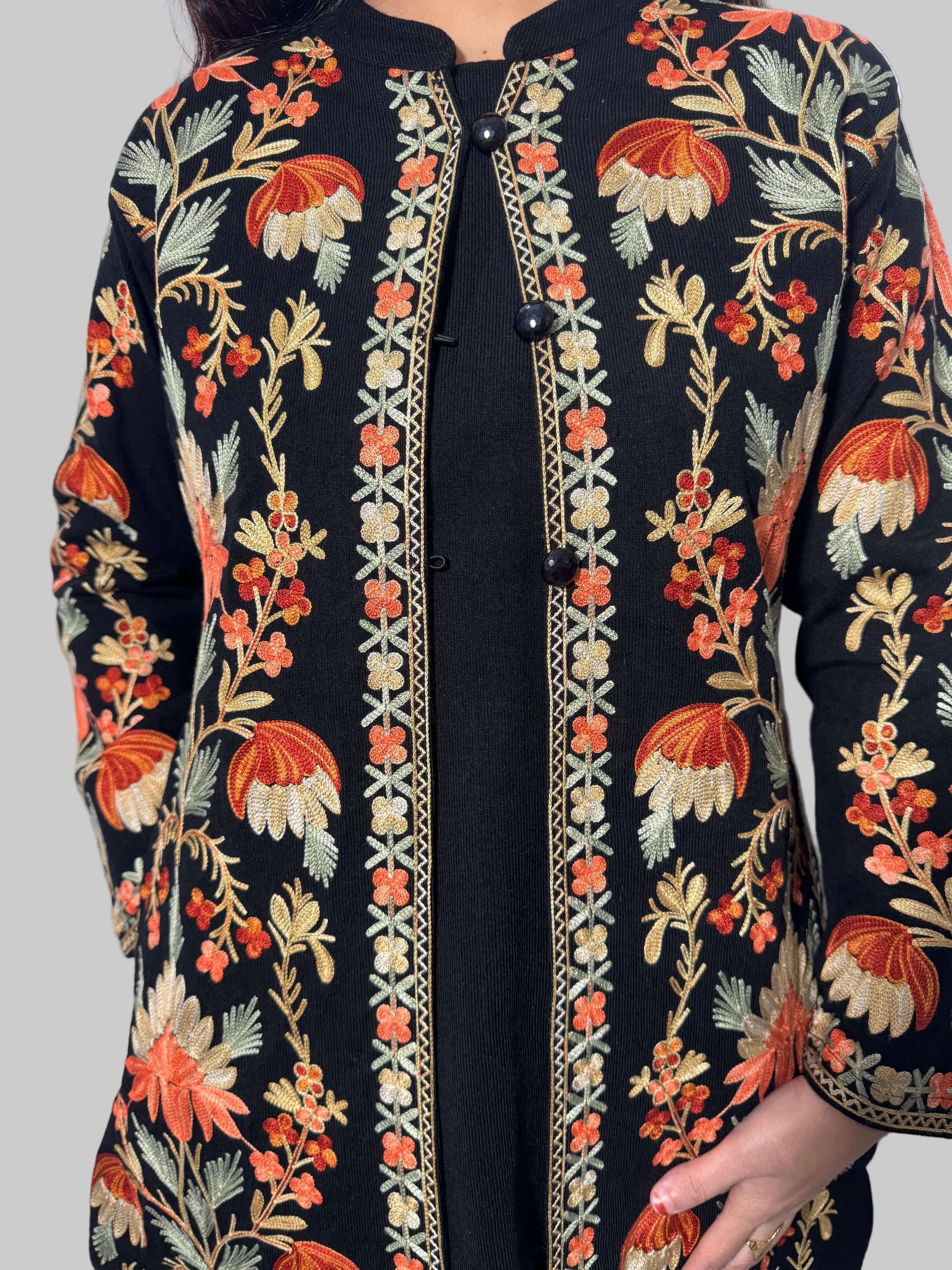 Discover timeless sophistication with this black full-length Kashmiri embroidered jacket, adorned with intricate multicolor floral threadwork, which comes with woolen trouser and inner. Crafted for luxury and comfort, this statement piece features long sleeves and premium fabric, perfect for festive occasions, weddings, parties, and formal gatherings. The jacket’s rich detailing and graceful silhouette make it a must-have for every modern woman’s ethnic wardrobe. Shop now for authentic Indian ethnic wear that blends tradition and contemporary style, only at our online fashion boutique.