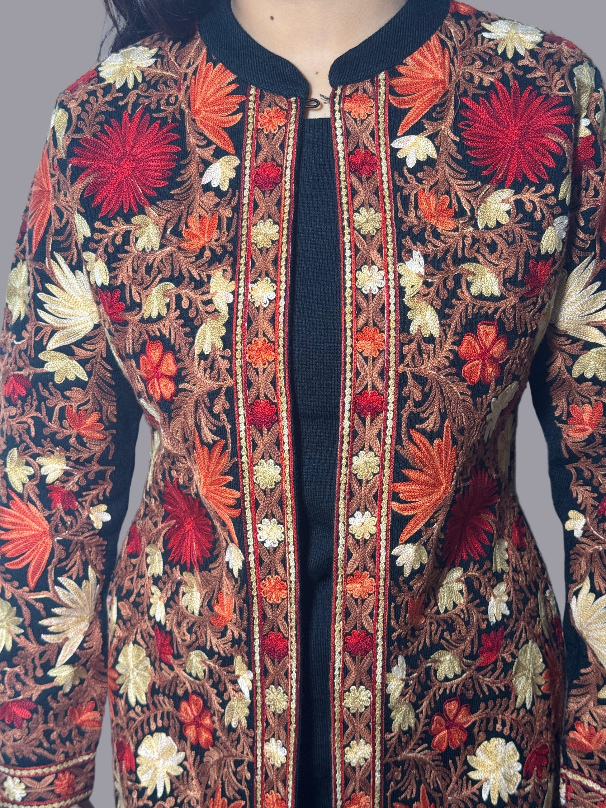 Discover timeless sophistication with this 3pcs woollen set, having a woollen trouser,woollen inner and a black full-length Kashmiri embroidered jacket, adorned with intricate multicolor floral threadwork. Crafted for luxury and comfort, this statement piece features long sleeves and premium fabric, perfect for festive occasions, weddings, parties, and formal gatherings. The jacket’s rich detailing and graceful silhouette make it a must-have for every modern woman’s ethnic wardrobe. Shop now for authentic Indian ethnic wear that blends tradition and contemporary style, only at our online fashion boutique.