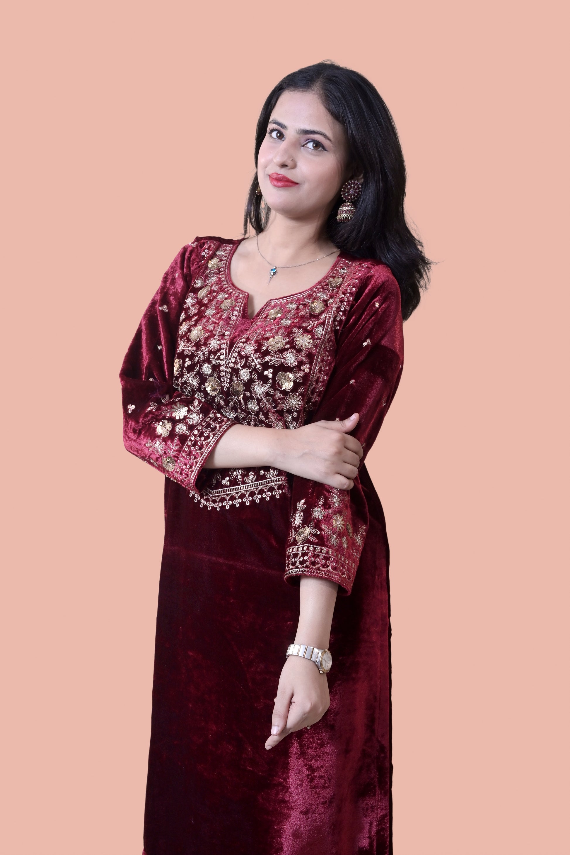 The Maroon Velvet Yoke Design Kurta Set is an elegant and sophisticated ensemble, perfect for festive occasions or special gatherings. The standout feature of the design is the intricate yoke detailing, which is adorned with resham embroidery and comfort fit elasticated trouser offering warmth and ease in winters. This is elegantly complemented with a heavy velvet shawl with embroidery all over.