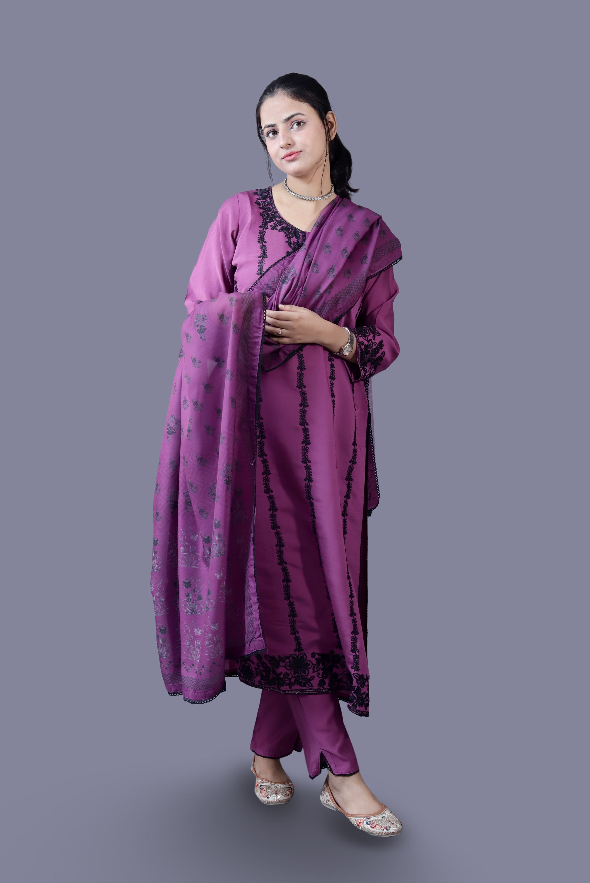 This three piece muslin kurta set features a straight fit kurta with beautiful thread embroidery and a regular fit trousers and beautiful digital print dupatta. Complemented with palazzo pants with a fully elasticated waistband. Highlighted with lace accents, this refreshing style is perfect as an elevated everyday wear.