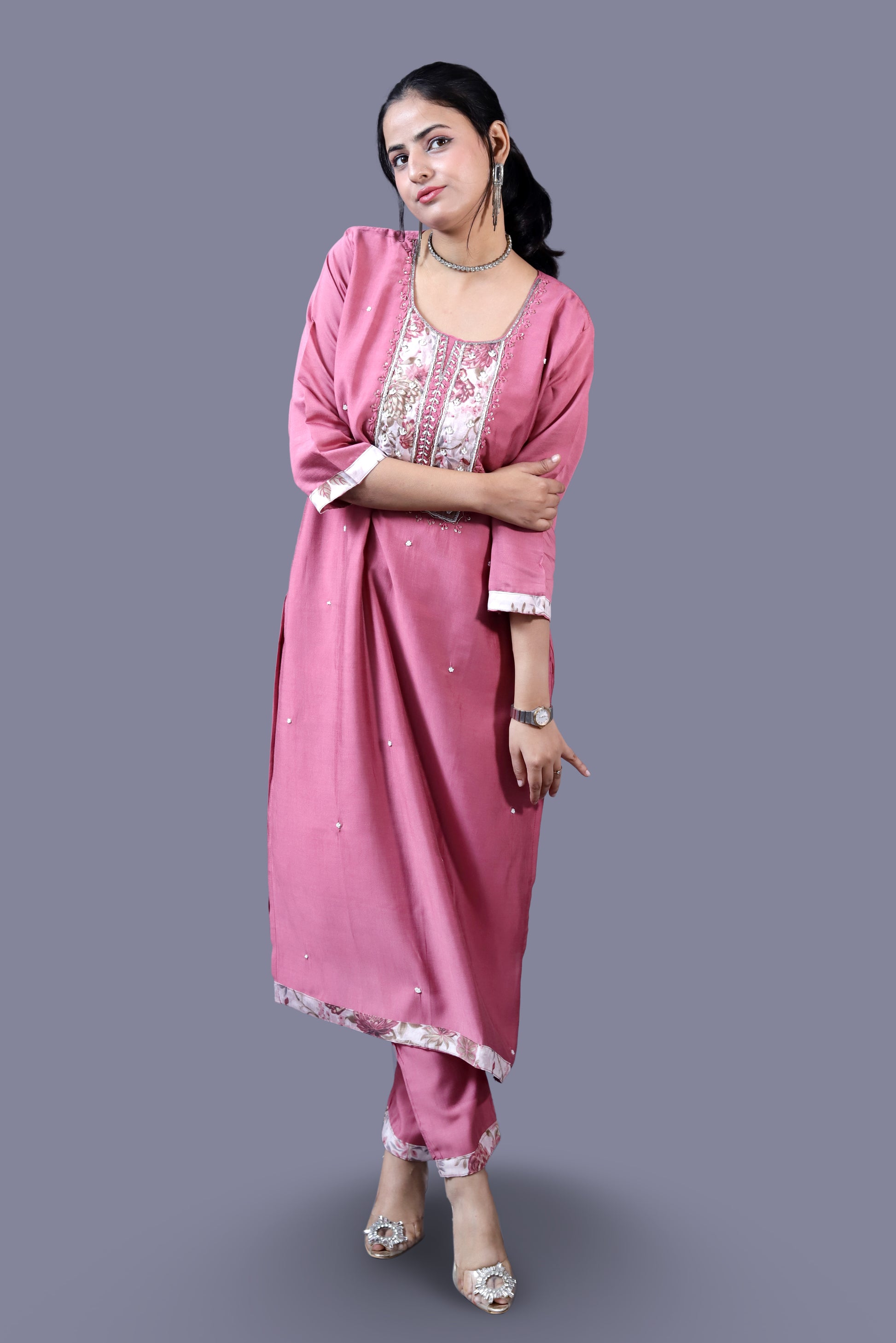 Our 3-piece peppy pink muslin suit features a straight-fit solid kurta with a notched neckline, three-quarter sleeves, and a statement yoke with a touch of handwork. Complemented with palazzo pants with a fully elasticated waistband and a beautiful printed dupatta. Highlighted with lace accents, this refreshing style is perfect as an elevated everyday wear.