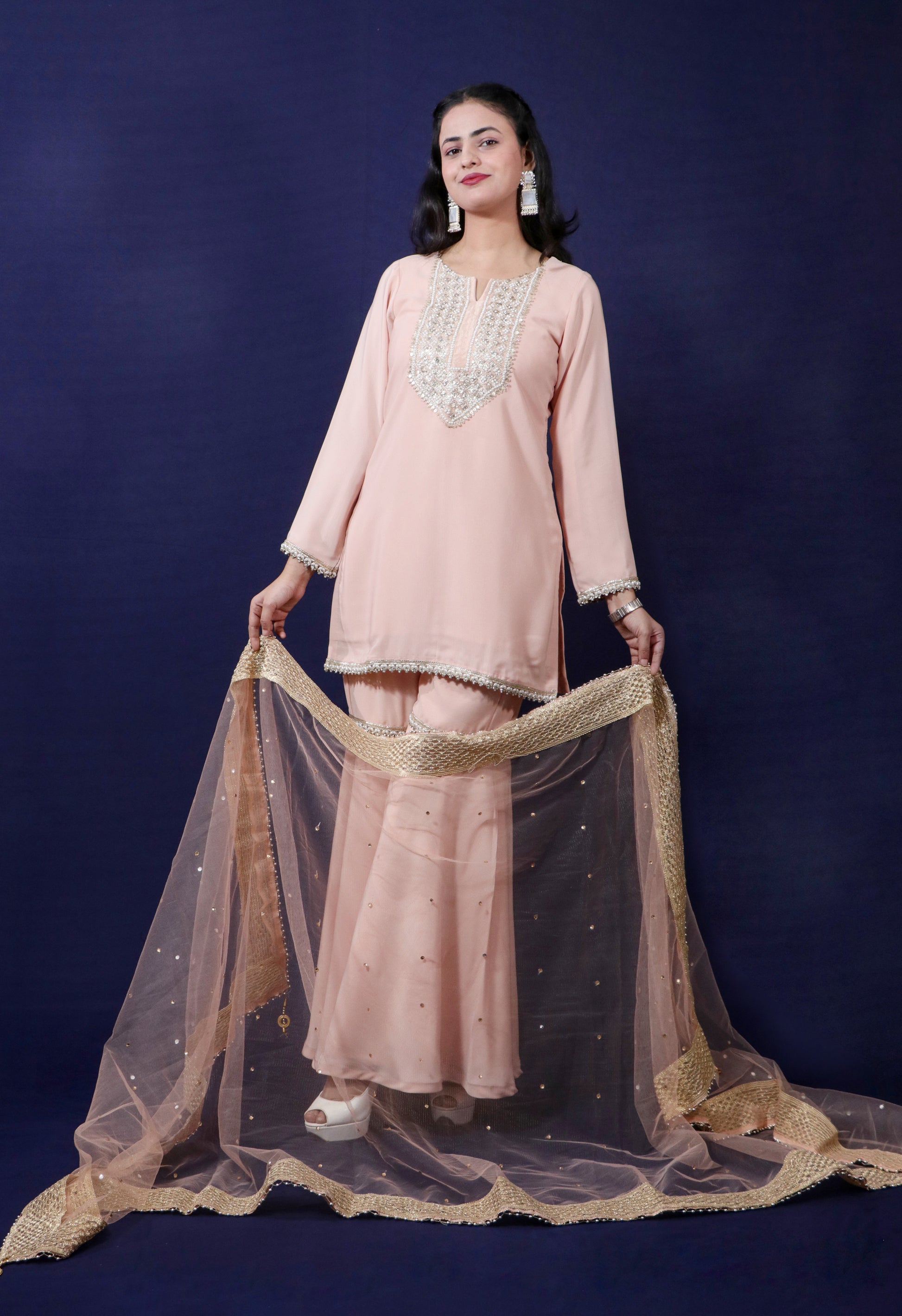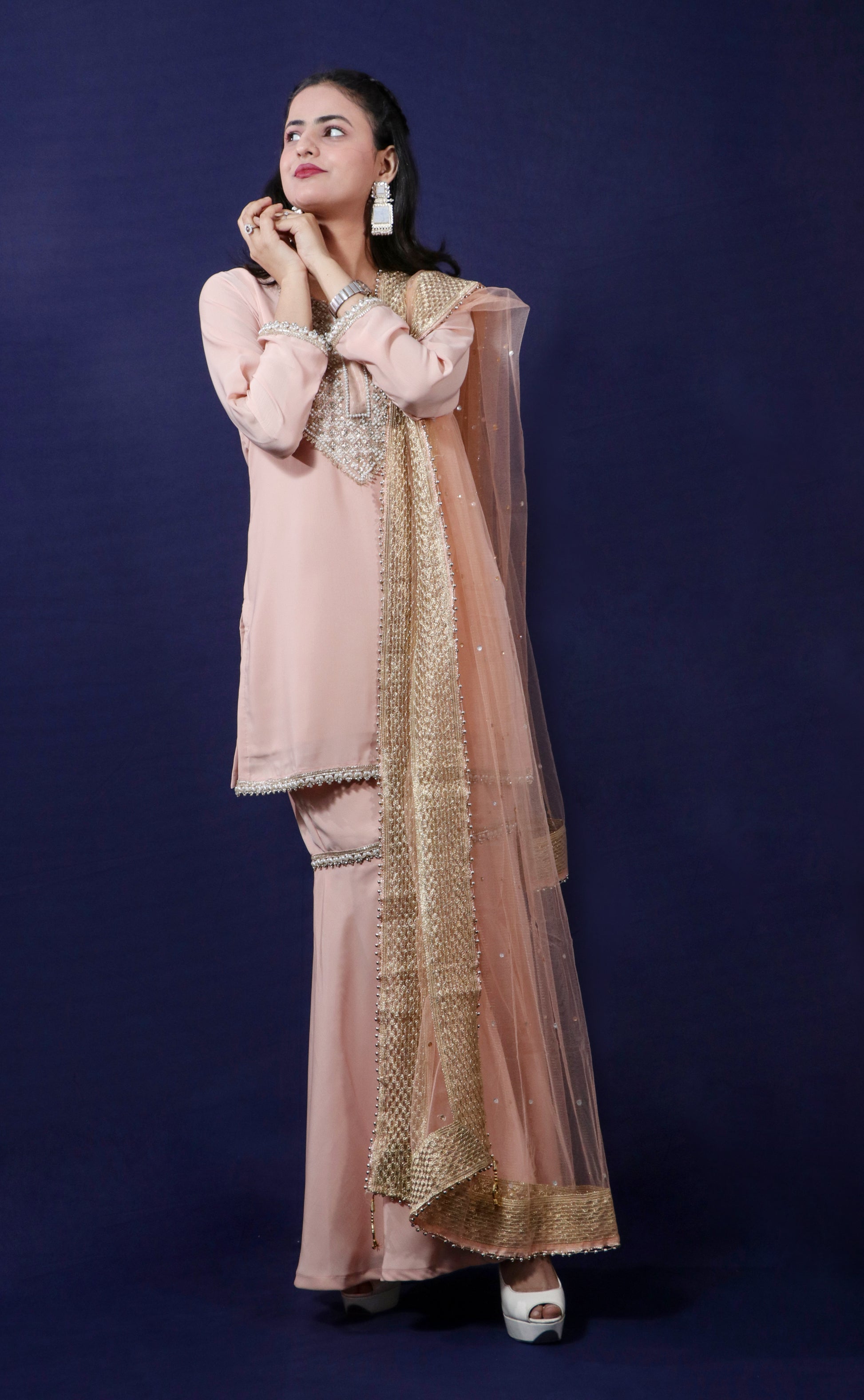 This exquisite light rose gold-colored gharara set is a perfect blend of traditional elegance and contemporary style. The ensemble features a beautifully crafted yoke neck kurti, adorned with intricate embroidery, sequins, or beadwork, adding a touch of sophistication. The gharara pants are tailored with a flared silhouette, starting from the knee, and are embellished to match the blouse, creating a harmonious look. The net dupatta adds a regal charm to the outfit. lace borders, making it a statement piece. The light rose gold hue lends a soft, feminine appeal, making it ideal for weddings, festive occasions, or formal events.