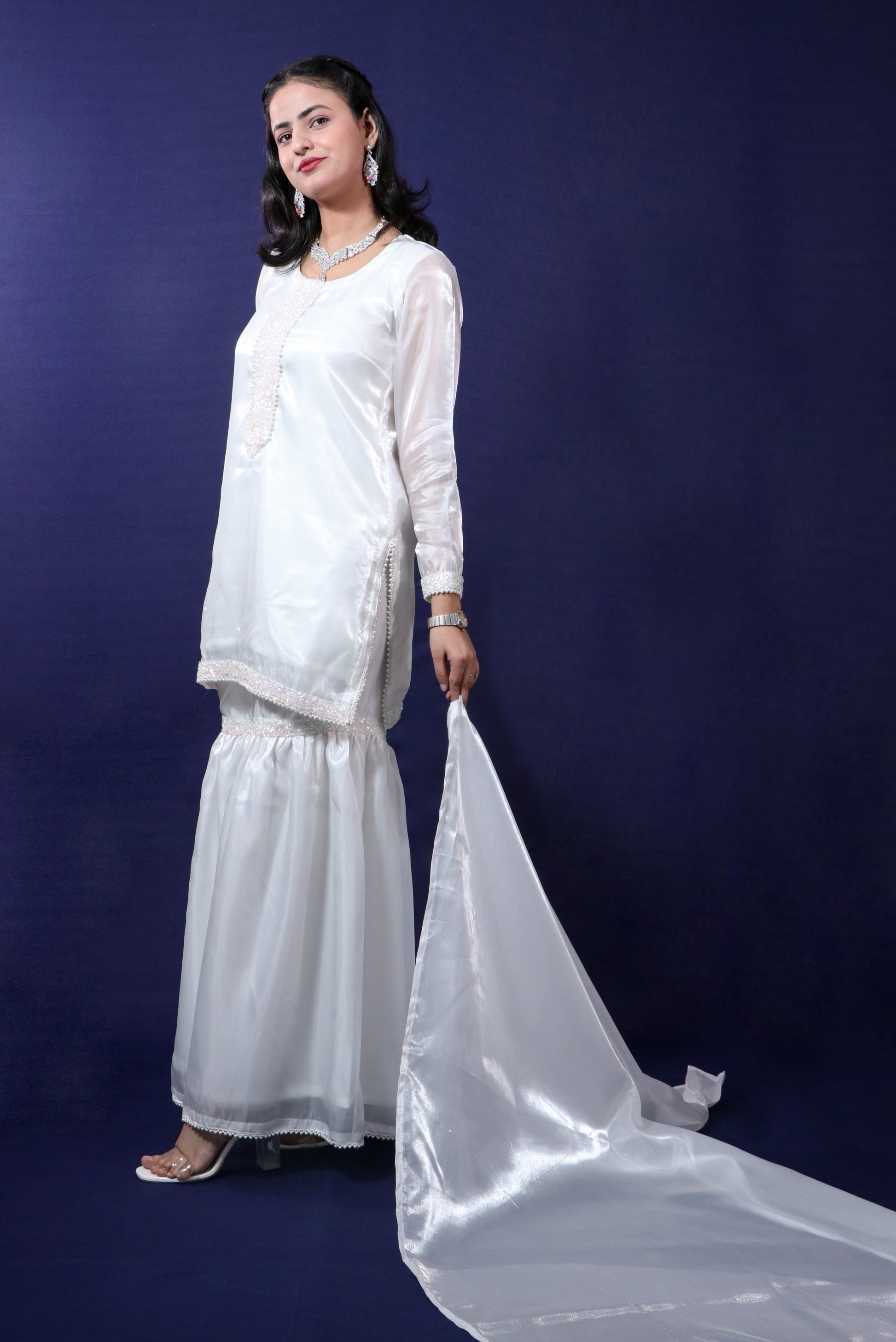 This elegant white gharara set, crafted from luxurious Jimmy Choo fabric, features a short-length kurti and a matching white dupatta, both made from the same exquisite fabric. The set is beautifully adorned with intricate cut dana and pearl lace detailing on the neck, sleeves, and panel, adding a refined and sophisticated touch. The gharara itself is further enhanced with delicate pearl lace along the bottom, completing the ensemble with a graceful, timeless appeal. Perfect for special occasions, this ensemble combines modern elegance with traditional charm.