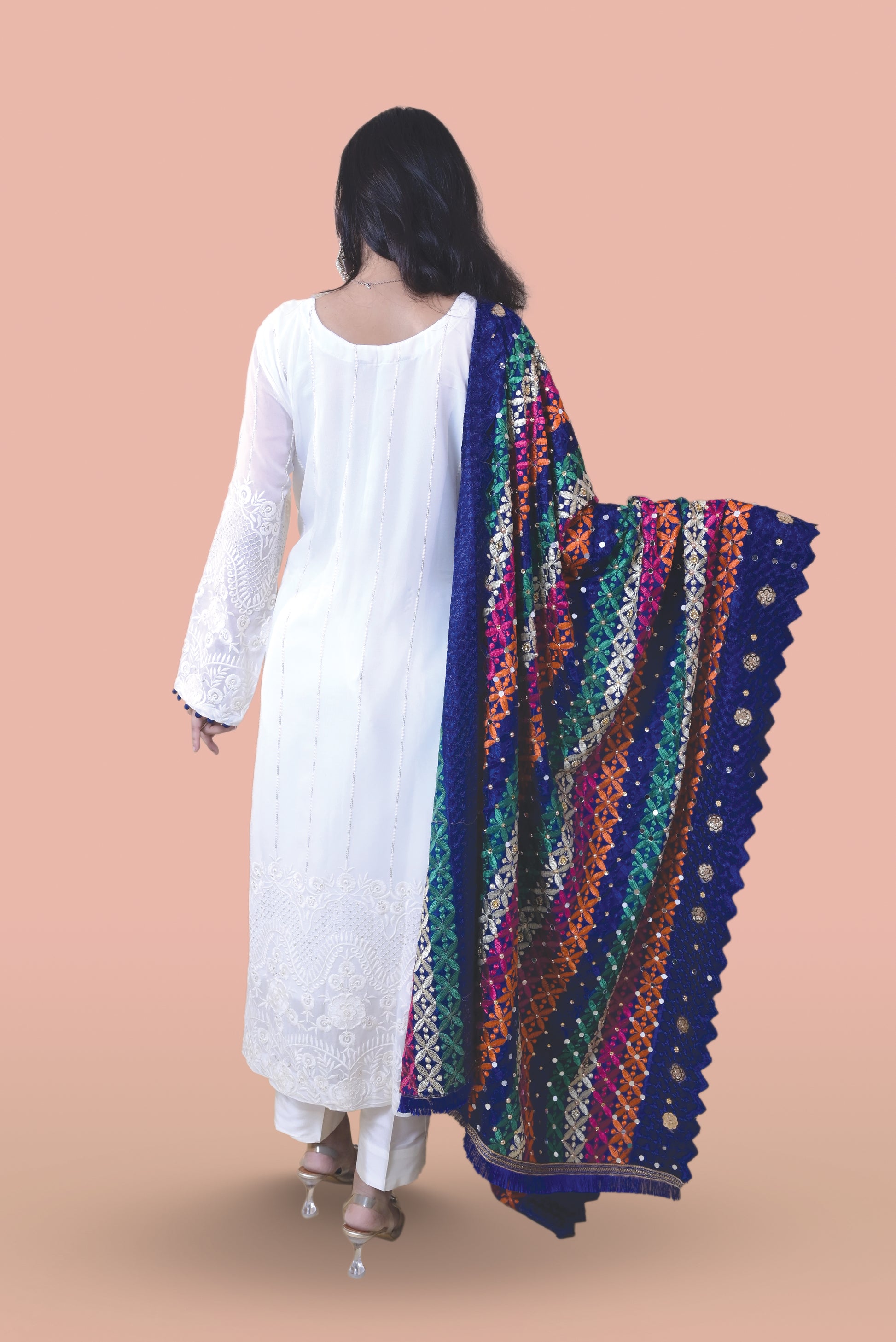 The White Suit with Blue Phulkari Dupatta is a stunning fusion of simplicity and tradition, perfect for those seeking an effortlessly elegant look. The pristine white suit offers a clean, fresh canvas that exudes understated beauty, making it ideal for daytime events, celebrations, or intimate gatherings.